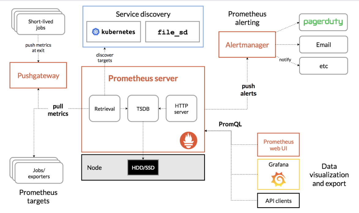 - 수집된 데이터는 시계열 데이터(TSDB, Time Series Database) 형태로 로컬 디스크에 저장