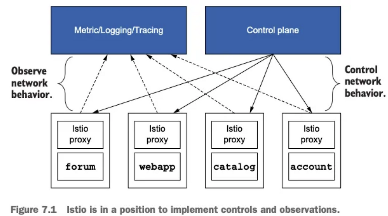 Istio는 서비스 메시(Service Mesh)로, Envoy 프록시를 각 서비스에 사이드카(sidecar)로 주입합니다. 이 덕분에 애플리케이션 코드를 수정하지 않고도 트래픽을 가로채 다양한 데이터를 수집할 수 있습니다.