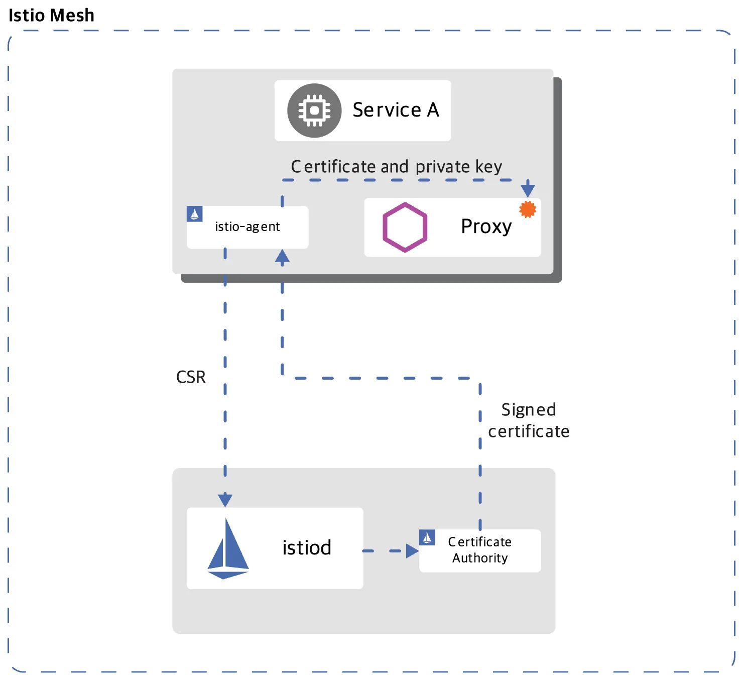 - istio-agent (pilot-agent): 파드 안에서 개인키 생성 → CSR 작성·전송 →(서명된) 인증서 수령 → Envoy에 제공까지 담당. 만료 시점도 모니터링