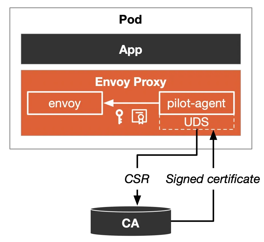 [Envoy sidecar] ──(SDS 요청, UDS)──▶ [istio-agent]